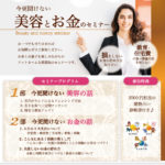 美容とお金のセミナー ターゲット:30-40代女性 保険のセミナーを女性の方にも気軽に受けてもらいたいという お客様のご要望の元、女性なら誰しも興味がある美容の要素を強め セミナー告知のチラシを作成さ …